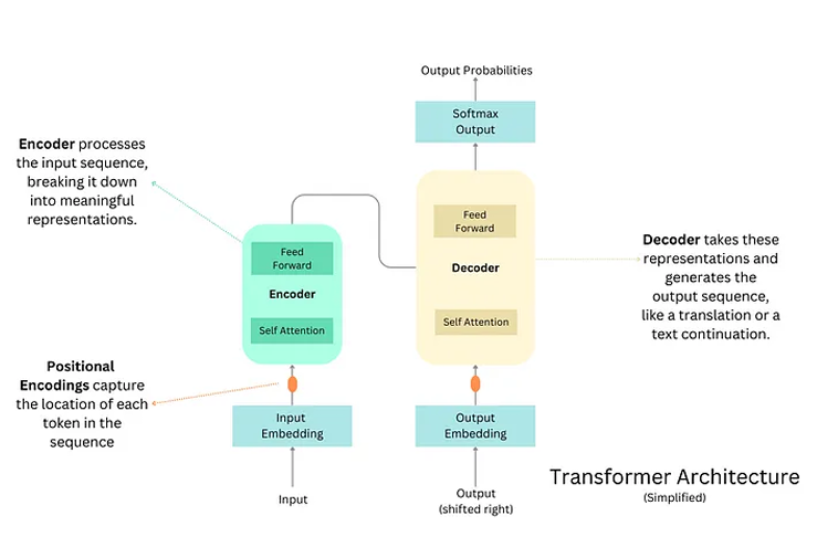 • A softmax function is applied to convert these values into a probability distribution, representing the likelihood of each possible word in the vocabulary being the next word in the output sequence.