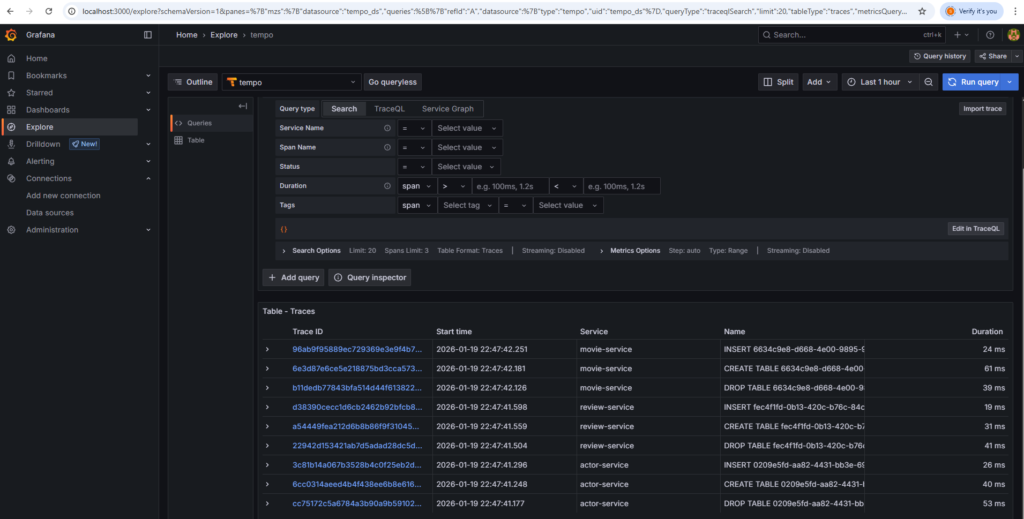 Navigate to the ‘Explore’. In the datasources, select ‘Tempo’. It should look similar to the following: